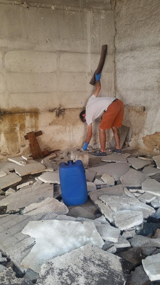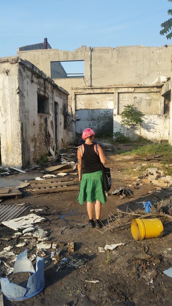 Sempre a giugno ho avuto il piacere di tornare nella fabbrica abbandonata in cui il mio amico Iakovos Volkov sta realizzando, ormai da mesi, una lunga serie di installazioni, con l’obiettivo di dare vita a una sorta di esposizione personale. Devo confessare di essere davvero legata questo posto. Lo amo da un punto di vista estetico, poiché da tanto sono sensibile al fascino del degrado, da un punto di vista artistico, poiché trovo straordinario il modo in cui le sue opere valorizzano spazi ed elementi architettonici, e infine da un punto di vista affettivo, avendolo visitato praticamente in ogni stagione a partire dallo scorso settembre. Durante il pomeriggio Iakovos ha iniziato a lavorare a una grande scritta realizzata con materiali trovati sul posto (la maggior parte delle sue opere sono in situ e site specific) e insieme o separatamente siamo andati alla ricerca di altri materiali.