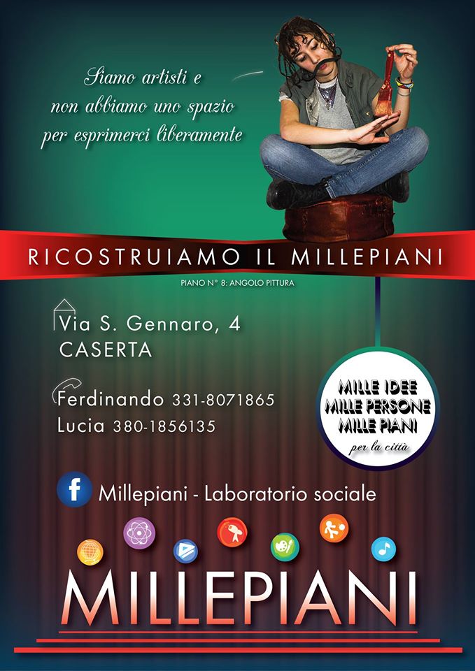 Non ho avuto ancora mai il piacere di andare a Caserta, ma, seppur a distanza, inizio a conoscerla un po’ meglio, grazie ai tanti interventi artistici di Bifido. E ora, sempre grazie a lui, sono venuta a conoscenza di una bellissima realtà sociale locale, ovvero il Laboratorio Sociale occupato Millepiani.